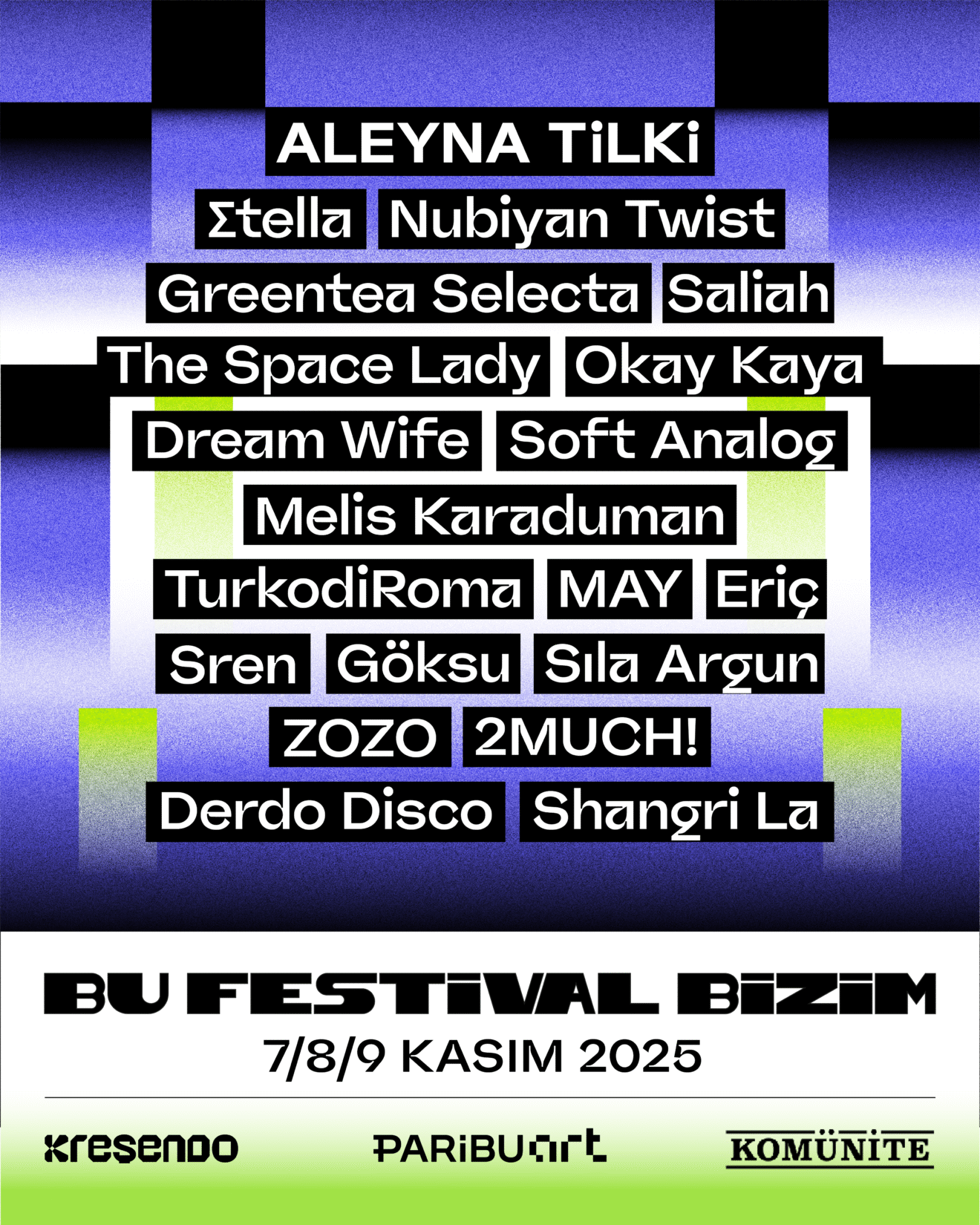 Festival kapsamında İstanbul’un kültür sanat haritasına yeni bir deneyim ve topluluk oluşturma noktası olarak eklenen Paribu Art sahnesinde, 80’lerin synth-pop standartlarını, standart tanımayan elektro-pop algısıyla modernize eden Yunan şarkıcı ve şarkı yazarı Σtella, Türkiye’den çıkıp pop, dans, rock ve elektronik unsurları cesur bir görsel evrenle birleştirerek bölgesel sınırları aşan bir pop kimliği inşa eden ve Diplo, Dua Lipa, Sarah Hudson, King Henry ve Jr. Blender gibi küresel pop üreticilerinin imzasını taşıyan işbirlikleriyle global sahnede de iz bırakan bir müzisyene dönüşen ALEYNA TİLKİ, 2011’de Leeds’te kurulan ve üretimlerine Londra’da devam eden virtüöz müzisyenler, yetenekli prodüktörler ve ilham verici bestecilerin eşsiz ve bulaşıcı bir sound yaratmak üzere bir araya geldiği çok yönlü müzik kolektifi Nubiyan Twist, SWANA bölgesinin müziklerini, Birleşik Krallık ve ötesindeki bas ağırlıklı kulüp türleriyle kusursuz bir şekilde birleştiren özgün kavramsal sound’u ve teknik becerileriyle tanınan, İngiliz-Lübnan kökenli uluslararası üne sahip müzik yapımcısı ve DJ Saliah, farklı zaman ve mekânlarda müzikal ruh hâlleri yaratmaya ve dönüştürmeye yönelik kendine has yaklaşıma sahip olan DJ, müzik küratörü, koleksiyoncu ve radyo programcısı ZOZO, Ragamuffin tarzındaki soul, dub ve reggae etkili üretimleriyle tanınan Londra’da yerleşik neo-soul müzisyeni ve şarkı yazarı Greentea Selecta, Türkiye’ye özgü melodileri; 80’ler ve 90’ların ses dünyasından, özellikle synthesizer ve ritim makinelerinden aldığı ilhamla birleştiren electro-pop ikilisi Soft Analog, bağımsız şarkıcı ve söz yazarları olarak solo kariyerlerine de devam eden Seda Erciyes ve Tuğçe Şenoğul’un birlikte dans etmeyi çok sevdikleri şarkılardan oluşan setlerini dinleyicilerle buluşturdukları 2 MUCH!, çağdaş pop müziğin yükselen isimlerinden biri olarak güçlü vokali ve kendine özgü sahne enerjisiyle dikkat çeken Melis Karaduman, şarkılarında şehrini, ilişkilerini ve sürekli aklında dolaşan soruları işleyen ve alternatif pop ve rock gibi müzik tarzları harmanladığı besteler yapan Göksu, İzlandalı ve İngiliz üç müzisyen tarafından hayat bulan ve politik olanı eğlenceli olanla birleştirmede her zaman usta olan Dream Wife, yolculuğuna 70'lerin sonlarında Boston sokaklarında başlayan ve sokağın müzik hafızasıyla özdeşleşen, barış ve uyum mesajları veren yaşayan efsane The Space Lady, müzik üretmeye ve şarkı sözü yazmaya üniversite yıllarında başlayan Eriç, yaptıkları müzik türünü “bilinçaltı pop” olarak tanımlayan ve dinleyicilerine güvenli bir alan yaratarak, onların iç dünyalarıyla baş başa kalabilecekleri bir deneyim sunmayı amaçlayan TurkodiRoma, ve shoegaze, post-rock ve dream pop sularında dolaşan ve kendi duygusal evrenini sakin ama derin izler bırakan bir dille kuran İstanbul’un alternatif müzik sahnesinin öne çıkan gruplarından Sren dikkat çeken performansları ile “Bu Festival Bizim” kapsamında müzikseverlerle buluşacak.