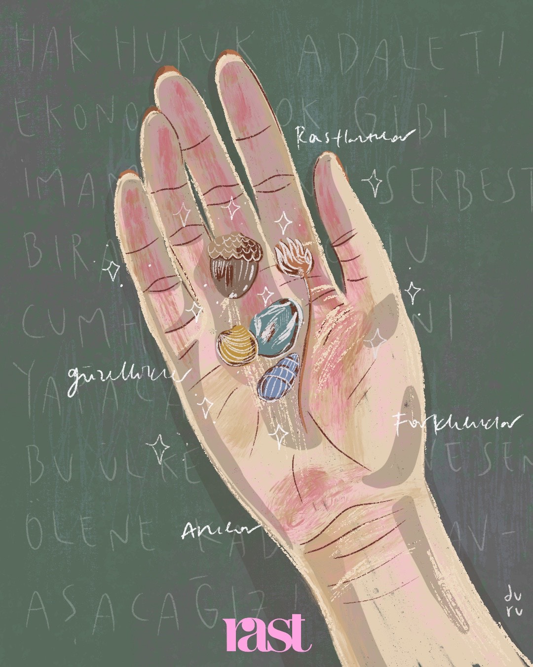 Çok sevdiğimiz Duru Ekşioğlu’nun birinci yılımız için hazırladığı illüstrasyonda bir avuç dolusu küçük ama kıymetli şey var: tohumlar, deniz kabukları, kozalaklar... Yani bizim gibi dünyayı, hayatı, sanatı, gülmeyi, güçleri birleştirmeyi sevenleri hayata tutunduran şeyler. Çizimin arkasında bir yılımızı özetleyen kelimeler. Ve görünmeyenler, Rastlantılar, kalabalıklar, voltalar, aralıklar, ferahlamalar... Tıpkı bu ülkede yaşamak gibi: Kırıntılarla kurulan cümleler, yasaklarla çevrili hayaller, yanan sevgiler, yine de umutsuzluğa boyun eğmeyenler. Bu yüzden bir avuç tohum var avcumuzda. Yaratmak, direnmenin en yumuşak ama en ısrarcı hali. Yaratmaya, yaratıcıları desteklemeye, ilham almaya ve ilham vermeye, paylaşmaya devam ediyoruz.